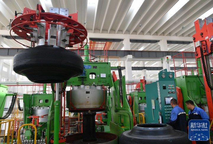 2月23日,在建新轮胎石狮工厂里,工人操作技术设备生产工矿轮胎。